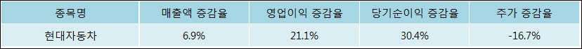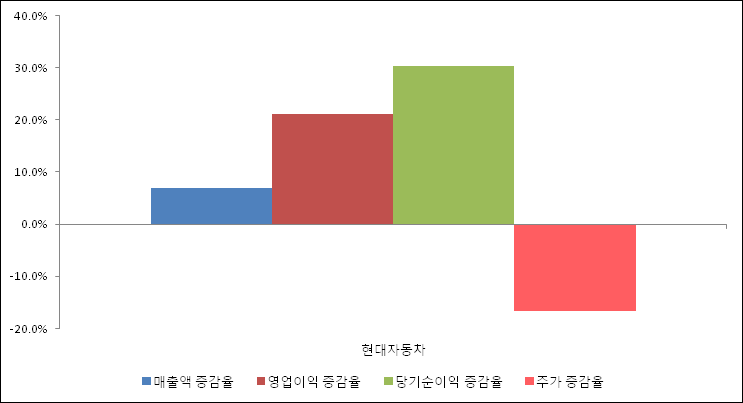 다음은 현대자동차와 동일 업종 내 비교 그룹 종목의 각각 최근 실적의 전년 동기 대비 성장률이다. 현대자동차의 매출액 증감율은 타 종목 대비 가장 우수한 편이다. 그리고 주가는 하락하였지만 가장 나은 상승률을 기록하였다.