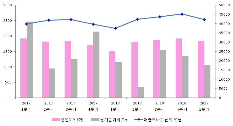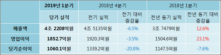 4월 26일 현대글로비스(086280)의 2019년 1분기 연결 잠정 실적이 발표됐다. 매출액 4조 2208억원으로, 영업이익은 1852.7억원으로 작년 같은 기간 대비 각각 12.6%, 23.1% 증가했다. 반면 당기순이익은 1060.1억원으로 7.6% 하락했다.