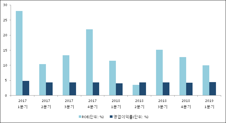 이번분기 기준으로 추정되는 현대글로비스의 자기자본이익률(ROE)은 10%로 나타났다. 전년 동기인 2018년 1분기 ROE는 11.5%로 이번 분기에 1.5%p 하락했다. 한편 동종목의영업이익률은 4.4%이다. 이는 최근 1년동안 큰 변동없이 비슷한 수치이다. 지난해 동기 영업이익률은 4%로 이번 1분기가 0.4%p 상승했다.