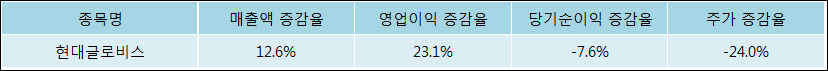 다음은 현대글로비스와 동일 업종 내 비교 그룹 종목의 각각 최근 실적의 전년 동기 대비 성장률이다. 현대글로비스의 매출액 증감율은 타 종목 대비 가장 우수한 편이다. 그리고 주가는 하락하였지만 가장 나은 상승률을 기록하였다.