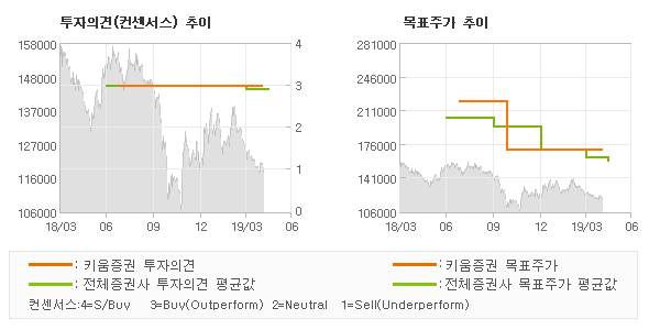 | 의견제시일자 | 증권사 | 투자의견 | 목표가 | | 20190426 | 유안타증권 | BUY(유지) | 160,000 | | 20190426 | NH투자증권 | BUY(유지) | 150,000 | | 20190426 | 미래에셋대우 | BUY | 176,000 | | 20190426 | 하나금융투자 | BUY | 160,000 |