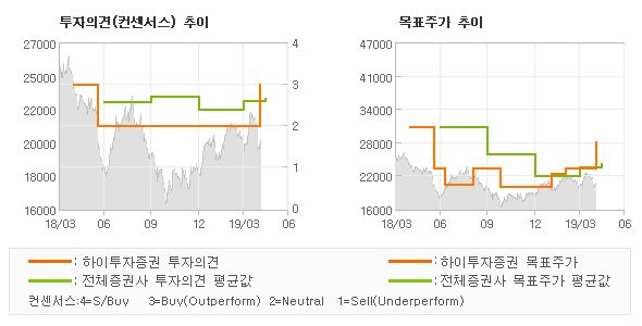| 의견제시일자 | 증권사 | 투자의견 | 목표가 | | 20190429 | 하이투자증권 | BUY(상향) | 28,000 | | 20190425 | DB금융투자 | BUY(유지) | 28,000 | | 20190425 | NH투자증권 | BUY(유지) | 24,000 | | 20190425 | 미래에셋대우 | BUY(유지) | 26,500 |