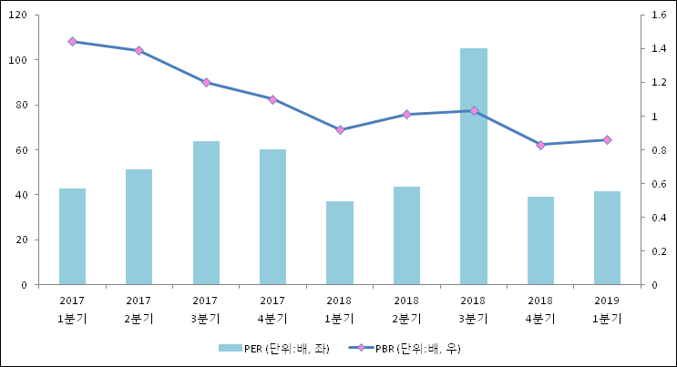주가가 1주당 수익의 몇배가 되는지 나타내는 주가수익비율(PER)은 41.4배로 나타났다. 전년 동기 PER은 37.31배로 이번 분기에 상승했다.주가가 1주당 순자산의 몇배인지 알려주는 주가순자산비율인 PBR은 0.86배이다. 지난해 동기 PBR은 0.92배로 이번 분기와 비슷한 수치이다.