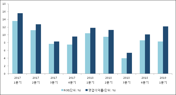 이번분기 기준으로 추정되는 케이티스카이라이프의 자기자본이익률(ROE)은 8.3%로 나타났다. 전년 동기인 2018년 1분기 ROE는 10.4%로 이번 분기에 2.1%p 하락했다. 한편 동종목의영업이익률은 12.2%이다. 지난해 동기 영업이익률은 11.8%로 이번 분기와 비슷한 수치이다.