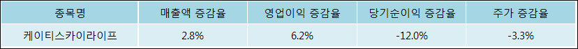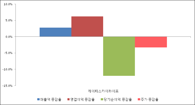 다음은 케이티스카이라이프와 동일 업종 내 비교 그룹 종목의 각각 최근 실적의 전년 동기 대비 성장률이다. 케이티스카이라이프의 매출액 증감율은 타 종목 대비 가장 우수한 편이다. 그리고 주가는 하락하였지만 가장 나은 상승률을 기록하였다.