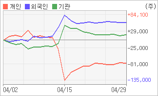 | 외국인/기관 순매수, 개인은 순매도(한달누적) 4월25일부터 전일까지 외국인이 3거래일 연속 순매도했다. 4주간을 기준으로 보면 외국인이 매수 우위를 유지하면서 58,241주를 순매수했고, 기관도 초반에 동종목을 순매수한 이후에 최근에는 순매수량이 줄어들고 있음에도 불구하고 17,299주를 순매수했다. 반면 개인들은 초반에 동종목을 순매도한 이후에 근래에는 순매도량을 줄이면서 76,739주를 순매도한 것으로 나타났다. |