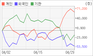 | 외국인과 기관은 순매도, 개인은 순매수(한달누적) 전일 기관이 17,137주를 순매수했고, 외국인은 7,632주를 순매도했다. 4주간을 기준으로 보면 외국인이 매도 우위를 지속하면서 50,522주를 순매도했고, 기관도 순매수에서 순매도로 반전되면서 14,567주를 순매도했지만, 개인은 오히려 매수반전의 모습을 보이며 60,937주를 순매수했다. |