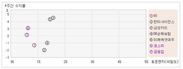 | 관련종목들 가운데서 변동폭은 높지만 수익률은 작아 30일 오후 2시55분 현재 전일대비 1.7% 하락하면서 51,900원을 기록하고 있는 GS는 지난 1개월간 2.26% 하락했다. 동기간 동안에 주가움직임의 위험지표인 표준편차는 0.8%를 기록했다. 이는 금융업 업종내에서 주요종목들과 비교해볼 때 GS의 월간 변동성이 가장 작았던 만큼 주가하락률도 주요종목군 내에서 상대적으로 낮았다는 것을 의미한다. 최근 1개월을 기준으로 GS의 위험을 고려한 수익률은 -2.8을 기록했는데, 변동성은 가장 낮았지만 주가가 하락했기 때문에 위험대비 수익률은 가장 저조한 수준을 나타냈다. 게다가 금융업업종의 위험대비수익률 0.4보다도 낮기 때문에 업종대비 성과도 좋지 않았다고 할 수 있다. 다음으로 업종과 시장을 비교해보면 GS가 속해 있는 금융업업종은 코스피지수보다 변동성과 수익률이 모두 낮은 모습을 보여주고 있다. 다시 말해서 동업종의 탄력이 떨어지면서 업종상승률도 미진했다는 의미이다. |