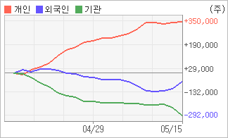 | 외국인과 기관은 순매도, 개인은 순매수(한달누적) 기관이 2일연속 주식을 팔고 있는 반면 외국인은 3일연속 주식을 사고 있다. 4주간을 기준으로 보면 외국인이 매도 우위를 지속하면서 58,761주를 순매도했고, 기관도 매도 관점으로 접근하면서 291,029주를 순매도했지만, 개인은 오히려 순매수량을 늘리며 349,126주를 순매수했다. |