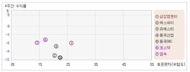 | 관련종목들 가운데서 변동폭은 낮지만 수익률은 커 16일 오후 1시55분 현재 전일대비 1.9% 하락하면서 4,645원을 기록하고 있는 삼강엠앤티는 지난 1개월간 7.84% 하락했다. 동기간 동안에 주가움직임의 위험지표인 표준편차는 2.1%를 기록했다. 이는 금속 업종내에서 주요종목들과 비교해볼 때 삼강엠앤티의 주가가 월간기준으로는 가장 선방하는 모습을 보였으나, 변동성도 가장 높은 수준을 유지했다는 뜻이기도 하다. 최근 1개월을 기준으로 삼강엠앤티의 위험을 고려한 수익률은 -3.7을 기록했는데, 변동성이 가장 컸음에도 불구하고 주가는 가장 선방하면서 위험대비 수익률은 가장 높은 수준을 나타냈다. 뿐만아니라 금속업종의 위험대비수익률인 -8.4보다도 높기 때문에 업종대비 성과도 좋았다고 할 수 있다. 다음으로 업종과 시장을 비교해보면 삼강엠앤티가 속해 있는 금속업종은 코스닥지수보다 변동성과 수익률이 모두 낮은 모습을 보여주고 있다. 다시 말해서 동업종의 탄력은 약한 반면 하락시에도 지수보다 낙폭이 작다는 의미이다. |