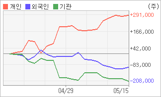 | 외국인과 기관은 순매도, 개인은 순매수(한달누적) 기관이 5일연속 주식을 팔고 있는 반면 외국인은 2일연속 주식을 사고 있다. 4주간을 기준으로 보면 외국인이 매도 우위를 지속하면서 102,785주를 순매도했고, 기관도 매도 관점으로 접근하면서 207,632주를 순매도했지만, 개인은 오히려 순매수량을 늘리며 290,718주를 순매수했다. |