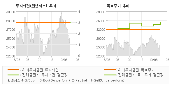 | 의견제시일자 | 증권사 | 투자의견 | 목표가 | | 20190516 | 대신증권 | BUY(유지) | 36,000 | | 20190516 | 하이투자증권 | BUY(유지) | 32,000 | | 20190516 | 한국투자증권 | BUY(유지) | 36,000 | | 20190426 | DB금융투자 | BUY | 38,000 |
