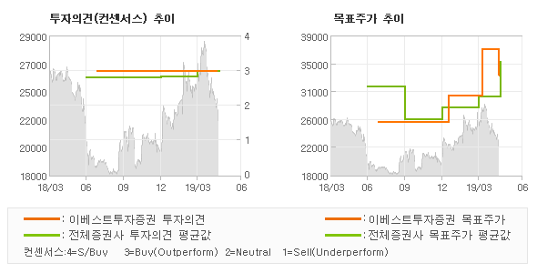 | 의견제시일자 | 증권사 | 투자의견 | 목표가 | | 20190516 | 대신증권 | BUY(유지) | 35,000 | | 20190516 | 신한금융투자 | BUY(유지) | 34,000 | | 20190516 | 이베스트투자증권 | BUY(유지) | 33,000 | | 20190418 | 현대차증권 | BUY | 35,000 |