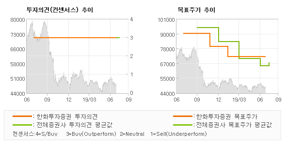 | 의견제시일자 | 증권사 | 투자의견 | 목표가 | | 20190719 | 한화투자증권 | BUY(유지) | 72,000 | | 20190716 | 대신증권 | BUY(유지) | 62,000 | | 20190704 | 키움증권 | BUY(유지) | 67,000 | | 20190613 | 신한금융투자 | BUY(신규) | 60,000 |