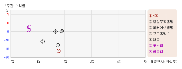 | 업종평균에 비해서 변동폭 대비 수익률은 다소 부정적 19일 오전 10시40분 현재 전일대비 1.14% 오른 13,300원을 기록하고 있는 HDC는 지난 1개월간 16.35% 하락했다. 같은 기간동안 변동성의 크기를 말해주는 표준편차는 1.7%를 기록했다. 이는 금융업 업종내에서 주요종목들과 비교해볼 때 HDC의 월간 변동성이 큰 편은 아니었으나 주가등락률은 마이너스를 기록하면서 주요종목군 내에서 가장 낮은 수준을 유지했다. 최근 1개월을 기준으로 HDC의 위험을 고려한 수익률은 -9.6을 기록했는데, 주가 약세와 더불어 위험대비 수익률도 부진을 면치 못했다. 게다가 금융업업종의 위험대비수익률인 -6.8보다도 낮기 때문에 업종대비 성과도 긍정적이라고 할 수 없다. 다음으로 업종과 시장을 비교해보면 HDC가 속해 있는 금융업업종은 코스피지수보다 변동성은 높고, 등락률은 낮은 모습이다. 하락할 때 지수보다 탄력을 받고 있다는 의미이다. |