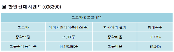 한일현대시멘트(006390)는 23일 최대주주 에이치엘케이홀딩스(주)를 비롯한 특별관계자의 보유주식이 감소되었다고 발표했다. 이는 직전 보고일보다 1,000주 감소하여 지분율은 84.24%로 하락했다. 이번 보고 사유는 특별관계자수감소(임원퇴임)및발행주식총수증가로 알려졌다.