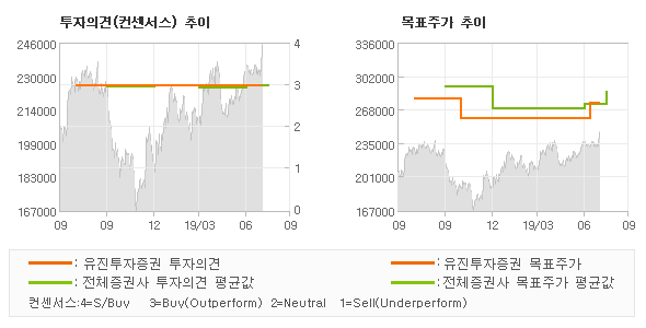 | 의견제시일자 | 증권사 | 투자의견 | 목표가 | | 20190725 | 유진투자증권 | BUY(유지) | 275,000 | | 20190725 | 이베스트투자증권 | BUY(유지) | 290,000 | | 20190725 | NH투자증권 | BUY(유지) | 280,000 | | 20190724 | 삼성증권 | BUY | 285,000 |