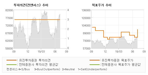 | 의견제시일자 | 증권사 | 투자의견 | 목표가 | | 20190726 | 신한금융투자 | BUY(유지) | 96,000 | | 20190726 | 유진투자증권 | BUY | 95,000 | | 20190726 | 메리츠종금증권 | TRADING BUY | 81,000 | | 20190726 | 미래에셋대우 | BUY(상향) | 100,000 |