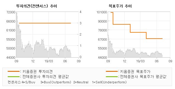 | 의견제시일자 | 투자의견 | 목표가격 | | 20190726 | BUY(유지) | 67,000 | | 20190704 | BUY(유지) | 67,000 | | 20190430 | BUY(유지) | 67,000 | | 20190328 | BUY(유지) | 75,000 | | 20190130 | BUY(MAINTAIN) | 75,000 |