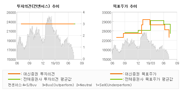 | 의견제시일자 | 증권사 | 투자의견 | 목표가 | | 20190801 | 대신증권 | BUY(유지) | 23,000 | | 20190626 | 하나금융투자 | BUY | 29,000 | | 20190621 | 신한금융투자 | BUY(유지) | 28,000 | | 20190621 | 키움증권 | BUY(유지) | 26,000 |