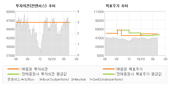 | 의견제시일자 | 증권사 | 투자의견 | 목표가 | | 20190731 | KB증권 | BUY(유지) | 56,000 | | 20190801 | 현대차증권 | BUY | 52,000 | | 20190801 | 대신증권 | BUY(유지) | 54,000 | | 20190801 | DB금융투자 | BUY(유지) | 57,000 |