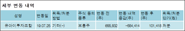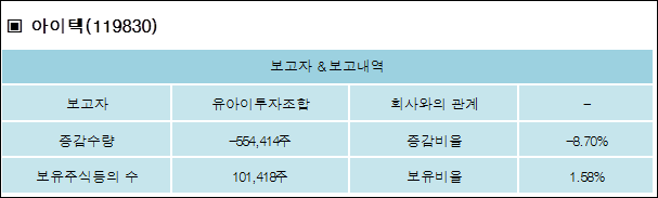 아이텍(119830)은 01일 - 유아이투자조합의 보유주식이 감소되었다고 발표했다. 이는 직전 보고일보다 554,414주 감소하여 지분율은 1.58%로 하락했다. 이번 보고 사유는 조합원일부분배로 알려졌다.