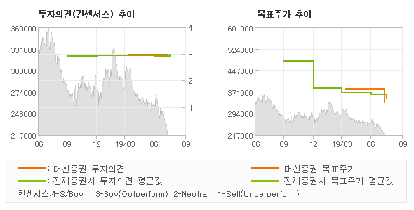 | 의견제시일자 | 증권사 | 투자의견 | 목표가 | | 20190806 | 대신증권 | BUY(유지) | 330,000 | | 20190806 | DB금융투자 | BUY(유지) | 320,000 | | 20190805 | 현대차증권 | BUY(유지) | 350,000 | | 20190729 | 키움증권 | BUY(유지) | 360,000 |