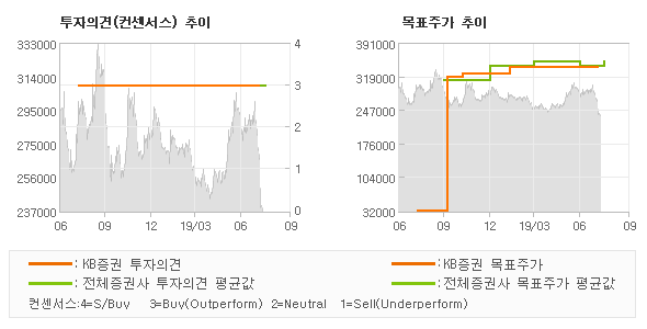 KB증권의 동종목에 대한 최근 1년동안의 투자의견은 전체적으로 큰 변화없이 유지되고 있다. 목표주가는 2018년8월 32,000원이 저점으로 제시된 이후 이번에 발표된 340,000원까지 꾸준하게 상향조정되어 왔다.