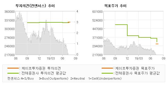 | 의견제시일자 | 증권사 | 투자의견 | 목표가 | | 20190806 | 케이프투자증권 | BUY(유지) | 310,000 | | 20190806 | NH투자증권 | BUY(유지) | 310,000 | | 20190806 | 하이투자증권 | BUY(유지) | 320,000 | | 20190806 | 하나금융투자 | BUY | 350,000 |