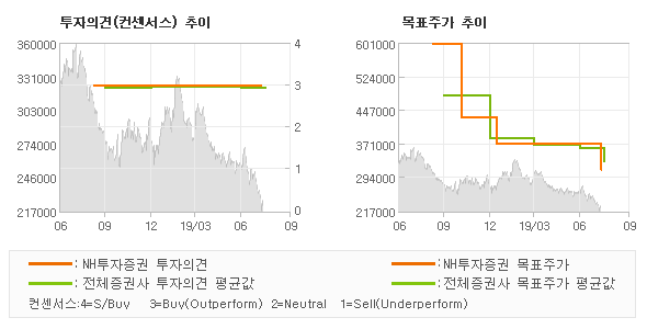 | 의견제시일자 | 증권사 | 투자의견 | 목표가 | | 20190806 | 키움증권 | BUY(유지) | 360,000 | | 20190806 | IBK투자증권 | BUY(유지) | 400,000 | | 20190806 | 미래에셋대우 | TRADING BUY | 250,000 | | 20190806 | 삼성증권 | BUY | 300,000 |