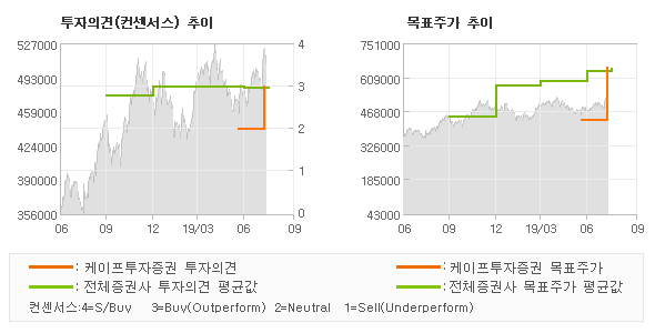 오늘 케이프투자증권에서 발표된 'BUY(상향)'의견 및 목표주가 650,000원은 전체의견에 수렴하면서 시장의 평균적인 기대감이 비교적 객관적으로 표현된 것으로 풀이되며 목표가평균과 대비해서 미미한 차이가 나는 것으로 집계되었다. 참고로 최근에 목표주가를 가장 공격적으로 제시한 NH투자증권에서 투자의견 'BUY(유지)'에 목표주가 750,000원을 제일 보수적인 의견을 제시한 키움증권에서 투자의견 'BUY(유지)'에 목표주가 520,000원을 제시한 바 있다.