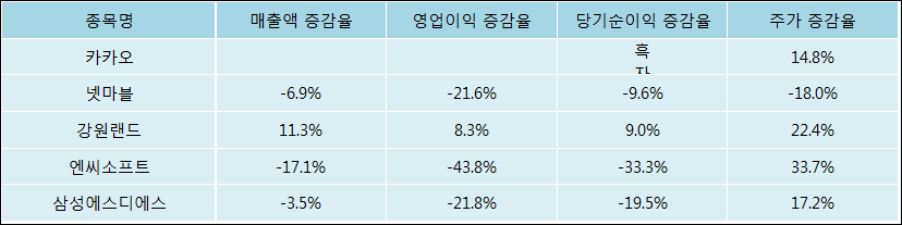 다음은 카카오와 동일 업종 내 비교 그룹 종목의 각각 최근 실적의 전년 동기 대비 성장률이다. 카카오의 매출액의 변동은 없지만 타 종목의 매출액 성장성이 악화된 것을 감안하면 우수한 편이다. 그리고 주가는 상승했지만 그 상승률은 낮은 편이다.
