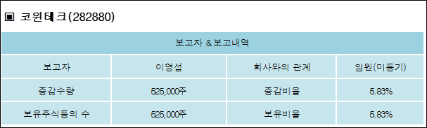 코윈테크(282880)는 07일 임원(미등기) 이영섭의 보유주식이 증가되었다고 발표했다. 이는 직전 보고일보다 525,000주 증가하여 지분율은 5.83%로 상승했다. 이번 보고 사유는 코스닥시장상장에 따른 신규보고로 알려졌다.