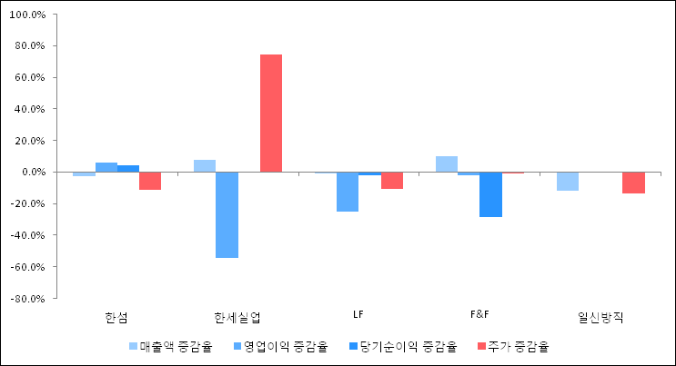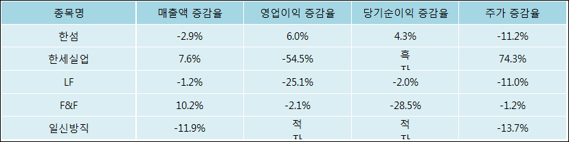 다음은 한섬과 동일 업종 내 비교 그룹 종목의 각각 최근 실적의 전년 동기 대비 성장률이다. 한섬의 매출액 증감율은 타 종목 대비 저조한 편이다. 그리고 주가의 하락율이 비교적 큰 편으로 나타났다.