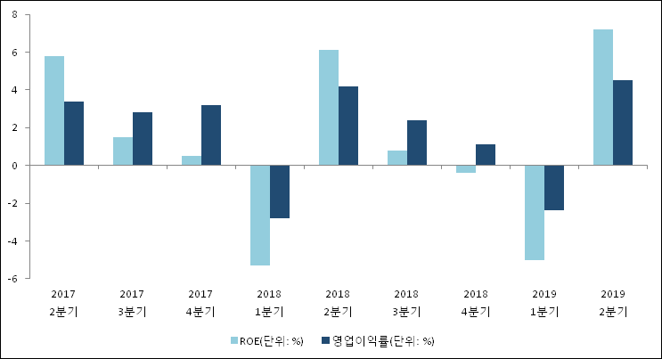 이번분기 기준으로 추정되는 삼화페인트공업의 자기자본이익률(ROE)은 7.2%로 나타났다. ROE는 최근 3분기 이상 연속으로 하락하다 이번 분기에 상승했다. 전년 동기인 2018년 2분기 ROE는 6.1%로 이번 분기에 1.1%p 상승했다. 한편 동종목의영업이익률은 4.5%이다. 최근 3분기 이상 연속으로 하락하다 이번 분기에 상승했다. 지난해 동기 영업이익률은 4.2%로 이번 분기와 비슷한 수치이다.