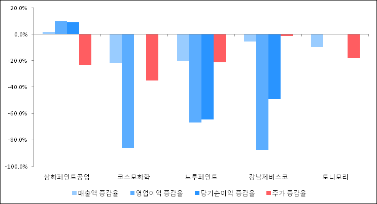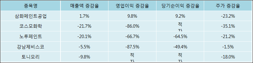 다음은 삼화페인트공업과 동일 업종 내 비교 그룹 종목의 각각 최근 실적의 전년 동기 대비 성장률이다. 삼화페인트공업의 매출액 증감율은 타 종목 대비 가장 우수한 편이다. 그리고 주가의 하락율이 비교적 큰 편으로 나타났다.