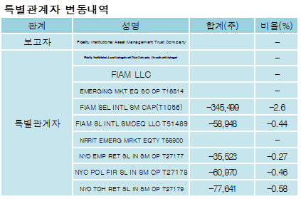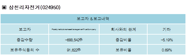 삼천리자전거(024950)는 08일 기타 FidelityInstitutionalAssetManagementTrustCompany를 비롯한 특별관계자의 보유주식이 감소되었다고 발표했다. 이는 직전 보고일보다 688,542주 감소하여 지분율은 0.69%로 하락했다. 이번 보고 사유는 단순주식처분에의한변동보고운용펀드해소에의한변동보고로 알려졌다.
