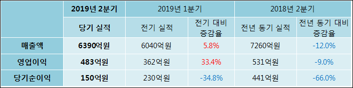 8월 8일 SKC(011790)의 2019년 2분기 연결 잠정 실적이 발표됐다. 작년 동기 대비해서 매출액, 영업이익, 당기순이익 모두 감소하였다. 매출액은 12% 감소한 6390억원을, 영업이익은 9% 감소하여 483억원으로 발표됐다. 당기순이익은 66% 줄어들어 150억원으로 집계되었다.