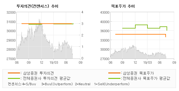 | 의견제시일자 | 증권사 | 투자의견 | 목표가 | | 20190807 | 삼성증권 | BUY | 34,000 | | 20190808 | 신한금융투자 | BUY(유지) | 36,500 | | 20190808 | 키움증권 | BUY(유지) | 38,000 | | 20190808 | 하나금융투자 | BUY | 40,000 |