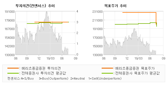 | 의견제시일자 | 증권사 | 투자의견 | 목표가 | | 20190809 | 메리츠종금증권 | BUY | 200,000 | | 20190809 | 미래에셋대우 | BUY(유지) | 200,000 | | 20190808 | 삼성증권 | BUY | 165,000 | | 20190809 | SK증권 | BUY(유지) | 210,000 |