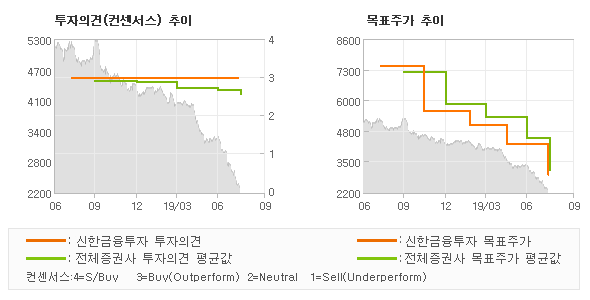 | 의견제시일자 | 증권사 | 투자의견 | 목표가 | | 20190809 | 신한금융투자 | BUY(유지) | 2,900 | | 20190809 | NH투자증권 | BUY(유지) | 3,100 | | 20190809 | 대신증권 | MARKETPERFORM | 3,000 | | 20190809 | DB금융투자 | HOLD(유지) | 2,500 |