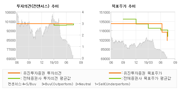 | 의견제시일자 | 증권사 | 투자의견 | 목표가 | | 20190809 | 유진투자증권 | BUY(유지) | 100,000 | | 20190809 | 유안타증권 | BUY(유지) | 110,000 | | 20190809 | 이베스트투자증권 | BUY(유지) | 95,000 | | 20190809 | 신한금융투자 | BUY(유지) | 100,000 |