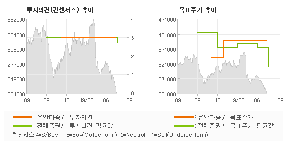 | 의견제시일자 | 증권사 | 투자의견 | 목표가 | | 20190807 | 유안타증권 | BUY | 310,000 | | 20190807 | DB금융투자 | HOLD(하향) | 260,000 | | 20190723 | 한화투자증권 | BUY(유지) | 320,000 | | 20190702 | SK증권 | BUY(유지) | 350,000 |