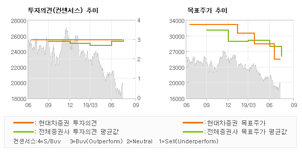 | 의견제시일자 | 증권사 | 투자의견 | 목표가 | | 20190812 | 현대차증권 | BUY | 25,000 | | 20190807 | 메리츠종금증권 | BUY | 26,000 | | 20190725 | DB금융투자 | BUY(유지) | 24,000 | | 20190709 | 대신증권 | BUY(유지) | 28,000 |