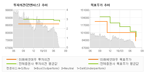 | 의견제시일자 | 증권사 | 투자의견 | 목표가 | | 20190814 | 미래에셋대우 | TRADING BUY | 81,000 | | 20190814 | 교보증권 | BUY(유지) | 100,000 | | 20190625 | NH투자증권 | BUY(유지) | 100,000 | | 20190531 | 한화투자증권 | HOLD(유지) | 90,000 |