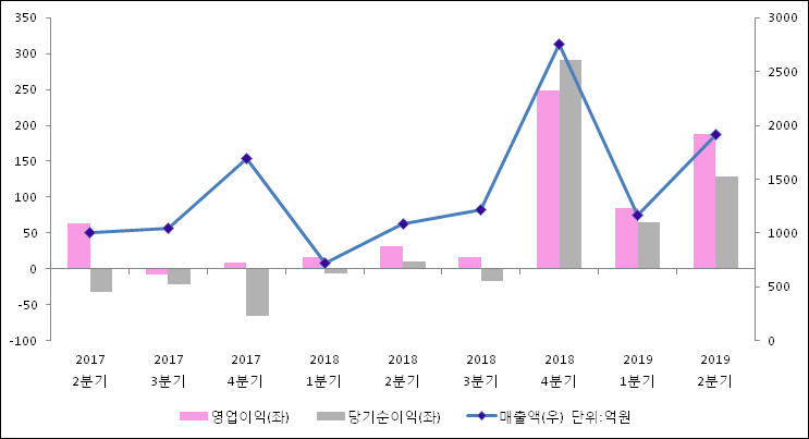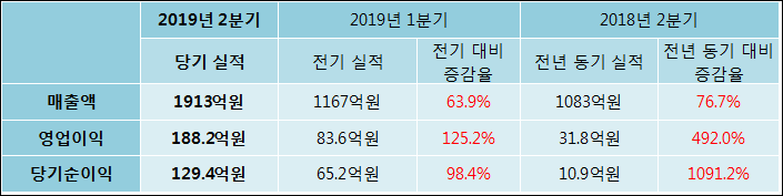 8월 14일 STX엔진(077970)의 2019년 2분기 연결 확정 실적이 발표됐다. 매출액, 영업이익, 당기순이익 모두 전년 같은 기간 대비 증가했다. 매출액은 76.7%, 늘어난 1913억원으로 발표됐다. 영업이익과 당기순이익은 각각 491.95%, 1091.16% 증가하여 188.2억원, 129.4억원으로 기록 되었다.
