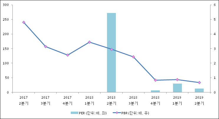 주가가 1주당 수익의 몇배가 되는지 나타내는 주가수익비율(PER)은 12.5배로 나타났다. 전년 동기 PER은 271.79배로 이번 분기에 하락했다.주가가 1주당 순자산의 몇배인지 알려주는 주가순자산비율인 PBR은 0.67배이다. 지난해 동기 PBR은 2.95배로 이번 2분기 PBR이 하락했다.