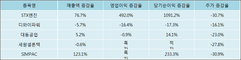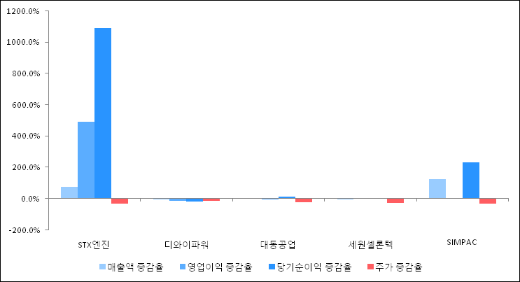 다음은 STX엔진과 동일 업종 내 비교 그룹 종목의 각각 최근 실적의 전년 동기 대비 성장률이다. STX엔진의 매출액 증감율은 타 종목 대비 우수한 편이다. 그리고 주가의 하락율이 비교적 큰 편으로 나타났다.