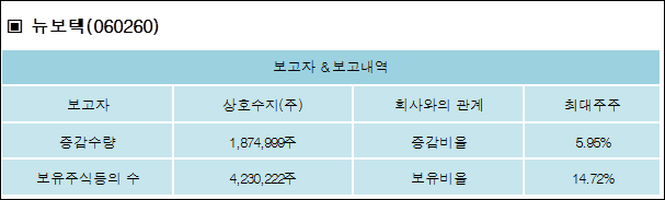 다음은 뉴보텍의 지분 변동 내역과 보유 내역이다.