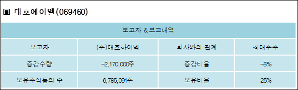 대호에이엘(069460)은 17일 최대주주 (주)대호하이텍의 보유주식이 감소되었다고 발표했다. 이는 직전 보고일보다 2,170,000주 감소하여 지분율은 25%로 하락했다. 이번 보고 사유는 장외매매계약체결으로 알려졌다.